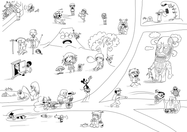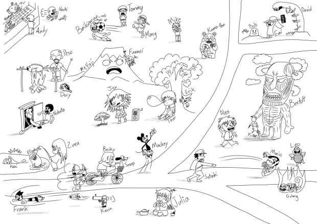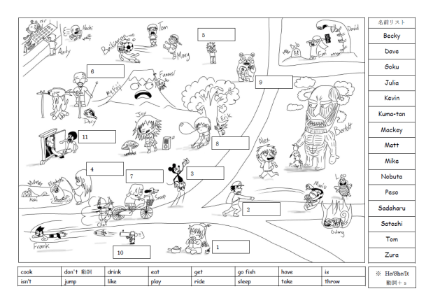 A JTE came up to me and asked me to draw her a picture of a lot of characters mid action for an observation lesson she would have the following month. But she wanted to start working on it so she was hoping I could finish it in the next few days. I drew it out on a large A3 sheet of paper with a pencil and then inked it. After I switched to pen any mistake or change I decided on required me to use whiteout and then run the picture through a copier. Eventually the finished product was scanned so it could be added to worksheets.