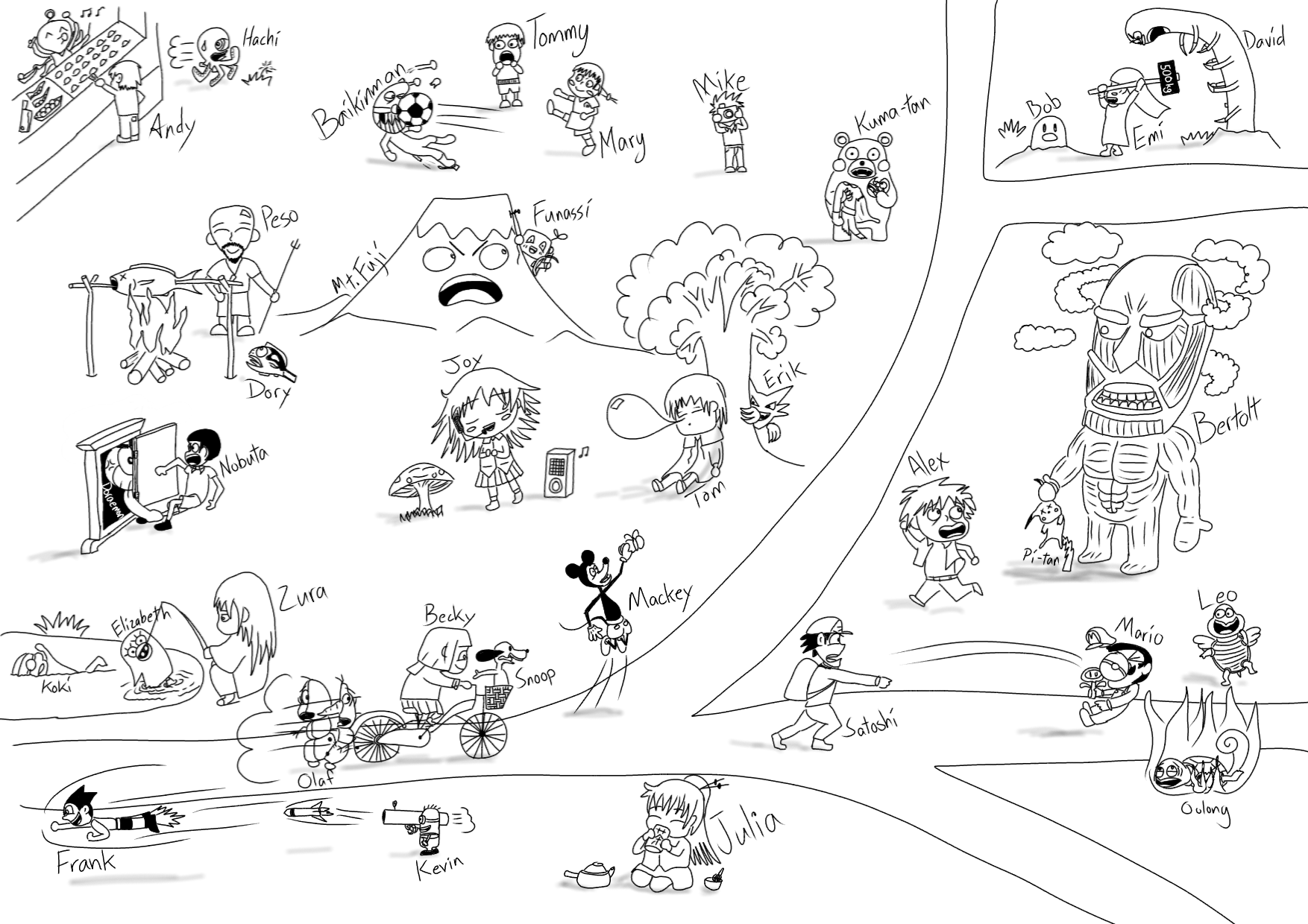 A JTE came up to me and asked me to draw her a picture of a lot of characters mid action for an observation lesson she would have the following month. But she wanted to start working on it so she was hoping I could finish it in the next few days. I drew it out on a large A3 sheet of paper with a pencil and then inked it. After I switched to pen any mistake or change I decided on required me to use whiteout and then run the picture through a copier. Eventually the finished product was scanned so it could be added to worksheets.